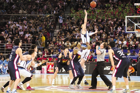 3月28日,北京金隅队主场对阵广东东莞银行队。两支球队全力争胜,观众助威也是亮点众多,让人见识了中国职业篮球联赛的进步。 新华社发
