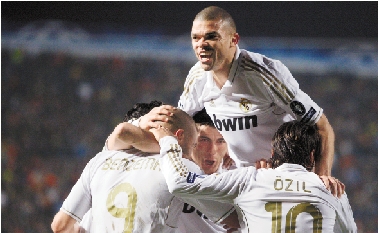 | 2011-2012赛季欧冠联赛8强战27日打响,皇家马德里队凭借卡卡的出色发挥客场3比0战胜希腊人竞技队。而另一支豪门切尔西队也在客场凯旋,1比0小胜本菲卡队。图为皇家马德里队球员在庆祝进球。 新华社发 欧冠: 皇马切尔西双双客场告捷 |