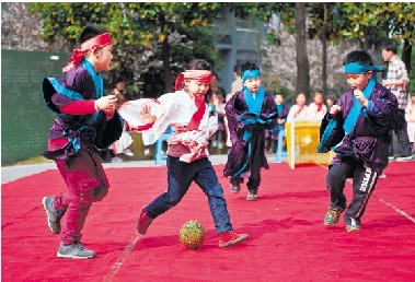 3月28日,杭州水澄桥社区开展清明文化活动,邀请幼儿园小朋友参加蹴鞠比赛等,重温清明节传统习俗。 本报记者 李震宇 通讯员 夏衍 摄