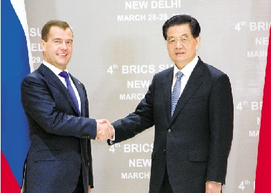 3月28日,胡锦涛会见俄罗斯总统梅德韦杰夫。 新华社记者 黄敬文 摄