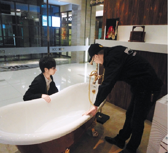 图为卢凯(左)在杭州第六空间品牌展厅检查产品质量。