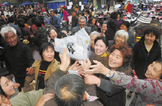 3月30日,舟山定海区金塘镇大丰农户在喜“抢”由供销社提供的放心农资。当天,由定海区供销及安监、农林等部门联合组织的“放心农资下乡、保障春耕生产”活动在大丰农贸市场举行。 姚峰 摄
