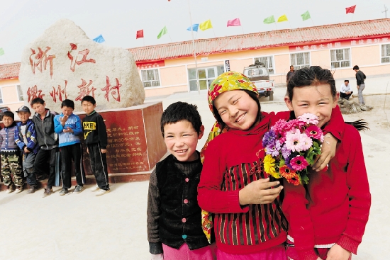 4月7日,新疆阿克苏地区乌什县衢州新村的孩子们在新房前合影。衢州新村由我省衢州市援建,于去年9月完工并交付使用,总投资1105万元。全村162户1021名农牧民由此住上了新房。 本报记者 储永志 通讯员 徐肖富 摄