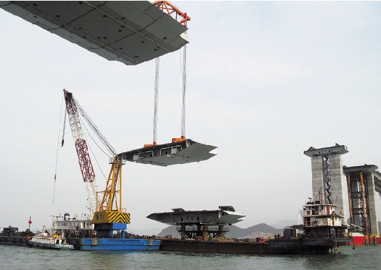 4月10日,象山港大桥第50片钢顺利告捷。这标志着主桥钢箱梁架设任务过半,主桥桥面共有钢箱梁99片,计划2012年6月底完成吊装工程。
