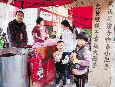 在金师傅的摊子前,小朋友买了烧饼后都不急着离开,而是快乐地边照镜子边吃烧饼。 方镖 摄