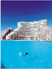 4月8日,在智利中部海滨城市阿尔加罗沃,一名游客在号称目前世界最大人工游泳池里游泳。这个游泳池长1013米,总面积达8公顷,相当于6000个标准的家用泳池,游客甚至可以在里面泛舟。 新华社记者 叶书宏 摄