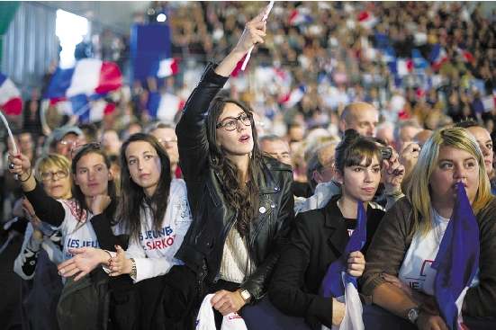 4月7日,在法国圣拉斐尔的一场竞选活动中,支持者们参加法国人民运动联盟的2012年总统候选人、现任法国总统萨科齐的竞选集会。 新华社发