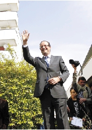 同日,法国社会党2012年总统候选人弗朗索瓦·奥朗德(中)在法国巴黎市郊举行的一场竞选活动中向支持者们挥手(右图)。 新华社发