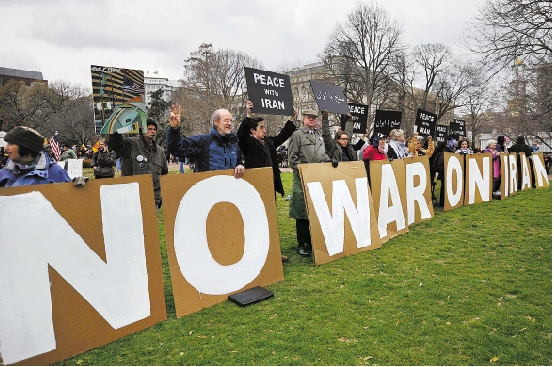 3月5日,在美国首都华盛顿白宫外,示威者打着“不要对伊朗开战”的标语。 新华社记者王轶欧摄