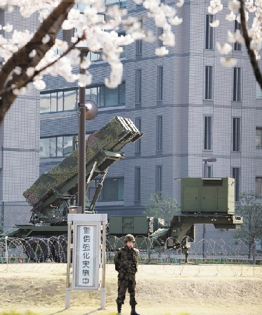4月9日,“爱国者3”型导弹发射装置停放在日本东京的防卫省总部运动场内。日本防卫省9日表示,为了应对朝鲜发射卫星,日本已经完成“爱国者3”型导弹在全国的部署工作。 新华社发