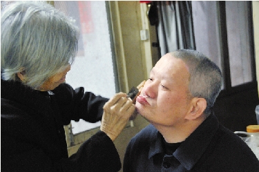 郭阿婆在为儿子刮胡子。