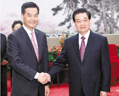 4月11日,国家主席胡锦涛在北京中南海会见新当选并获任命的香港特别行政区第四任行政长官梁振英。 新华社记者 庞兴雷 摄