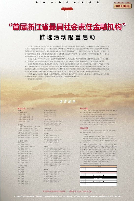 浙江日报举办“首届浙江省最具社会责任金融机构”推选活动,希望在转型升级时代强化金融机构的社会责任理念、树立金融行业的品牌领袖,与浙江企业一同迎接新一轮的经济浪潮,与浙江人民一同迈向崭新征程!
