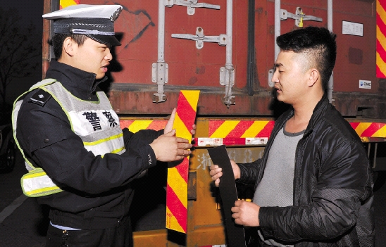 4月11日晚,高速交警绍兴支队民警对甬金高速上的集装箱车进行贴膜。这种磁性车身反光贴,反光效果好、磁性强。 张亮宗 盛炎锋 摄