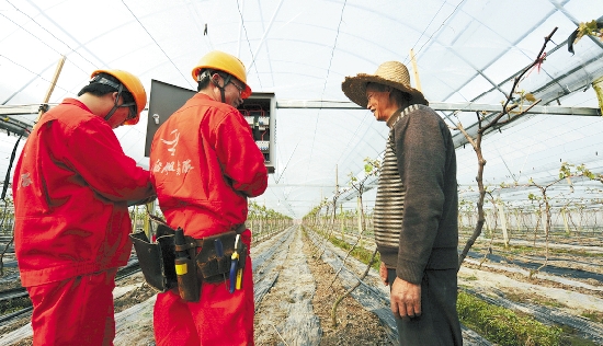 近日,在位于嘉兴市大桥镇绿江葡萄专业合作社,嘉兴电力局红船服务队员正在为葡萄大棚进行供电设施的检查。