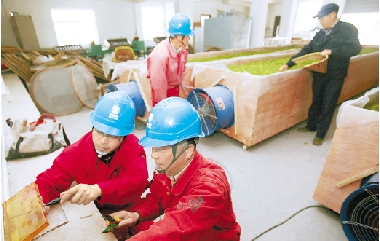安吉县梅溪电力所工作人员日前来到安吉白羽茶场维修电力设施,确保茶农正常用电。眼下正是茶农忙碌的季节,该县电力局派专人值班,确保茶农安全用电。 夏鹏飞 摄