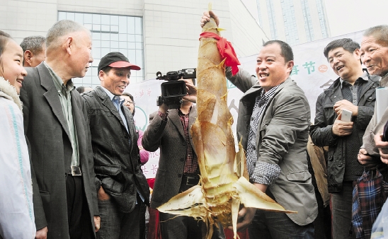 4月15日,金华婺城区沙畈乡举办竹笋节,梧桐村村民华委员一株重达16.5公斤的竹笋被评为“笋王”,现场卖出了3500元的高价。 李建林 摄