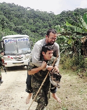4月14日,在秘鲁东南部库斯科省,一名士兵将脚部受伤的获救人质背往军用直升机。秘鲁国防部和内政部14日发表公报说,被秘鲁反政府武装组织“光辉道路”成员绑架的36名人质在秘鲁东南部的阿普里马克河谷全部获救。 新华社发