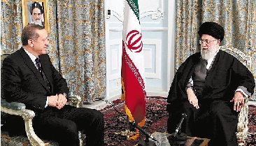 3月29日,伊朗最高领袖哈梅内伊(右)在伊东北部圣城马什哈德会见到访的土耳其总理埃尔多安。 新华社发