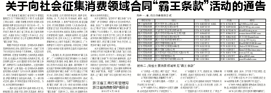 今年是我省实施《浙江省合同行为管理监督规定》(以下简称《规定》)十周年,也是国家工商总局统一部署开展整治利用合同格式条款侵害消费者合法权益专项行动的一年。为进一步营造放心的消费环境,维护公平的消费市场交易秩序,浙江省工商局、浙江省消保委决定,从通告发布之日起至5月20日止,在全省范围内开展向社会公开征集消费领域合同“霸王条款”活动。