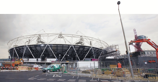 图为正在建设中的伦敦奥运会主体育场和奥运塔。 新华社发