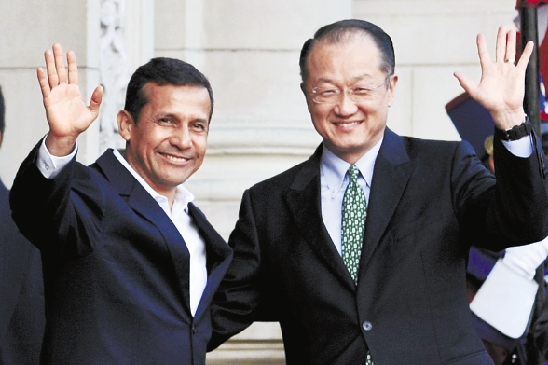 4月16日,在秘鲁首都利马,秘鲁总统乌马拉(左)会见韩裔美籍医学专家金墉。 新华社发