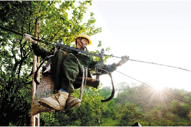 4月17日,上虞市广电部门工作人员在海拔近300米的岭南乡丁山村架设数字电视传输光缆,该村60多户农户将收看到更为清晰稳定的数字电视。