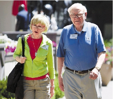 这是2011年7月6日在美国爱达荷州的森瓦利拍摄的巴菲特(右)与妻子外出就餐的资料照片。 新华社发