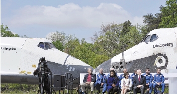 这是4月19日在美国首都华盛顿附近的史密森航空航天博物馆弗吉尼亚州分馆举行的“发现”号航天飞机交接仪式,远处是“发现”号航天飞机(右)和“企业”号航天飞机。 新华社记者 王轶欧 摄