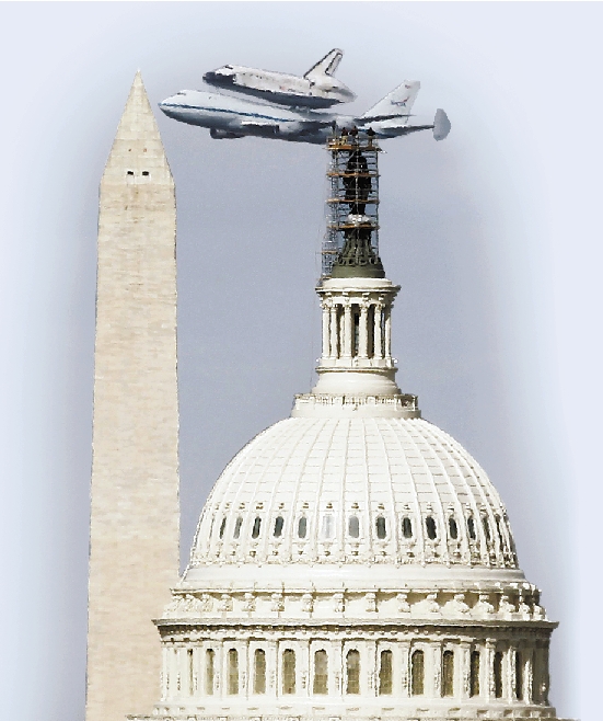 4月17日,“发现”号航天飞机搭乘一架波音747飞机从美国首都华盛顿的国会山(右)和华盛顿纪念碑附近飞过。