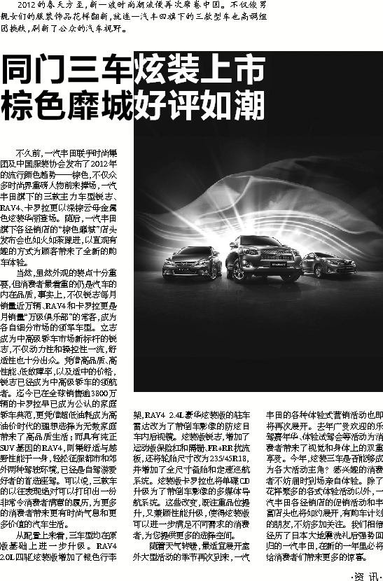 不久前,一汽丰田联手时尚集团及中国服装协会发布了2012年的流行颜色趋势——棕色,不仅众多时尚界重磅人物前来捧场,一汽丰田旗下的三款主力车型锐志、RAV4、卡罗拉更以深棕云母金属色炫装华丽登场。随后,一汽丰田旗下各经销店的“棕色靡城”店头发布会也如火如荼跟进,以直观有趣的方式为顾客带来了全新的购车体验。