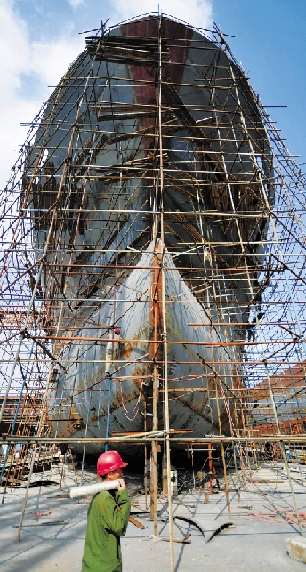 台州市椒江区一造船厂内,一艘船舶正在船坞里紧张建造中。