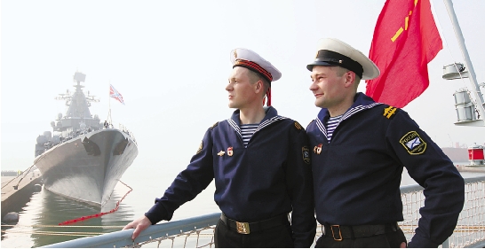 4月22日,俄罗斯海军水兵参观中国军舰。 新华社记者 查春明 摄