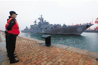 4月21日,俄罗斯太平洋舰队旗舰——“瓦良格”号导弹巡洋舰驶入青岛某军港。