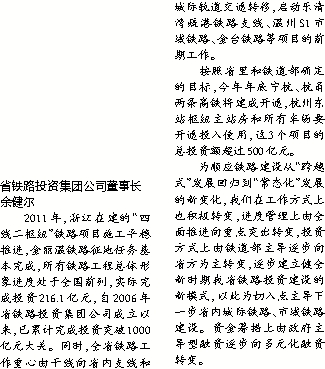 2011年,浙江在建的“四线二枢纽”铁路项目施工平稳推进,金丽温铁路征地任务基本完成,所有铁路工程总体形象进度处于全国前列,实际完成投资216.1亿元,自2006年省铁路投资集团公司成立以来,已累计完成投资突破1000亿元大关。同时,全省铁路工作重心由干线向省内支线和城际轨道交通转移,启动乐清湾疏港铁路支线、温州S1市域铁路、金台铁路等项目的前期工作。