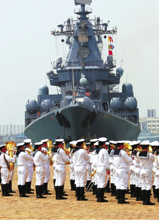 4月27日,俄罗斯海军“瓦良格”号导弹巡洋舰驶离青岛。 新华社记者 查春明 摄