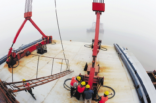 5月1日,在嘉绍大桥工地上,工人正在安装主跨的第一块桥面钢箱梁。嘉绍大桥整个桥面需要376块钢箱梁,预计今年10月底合龙。 本报记者 梁臻 绍兴日报记者 袁云 摄