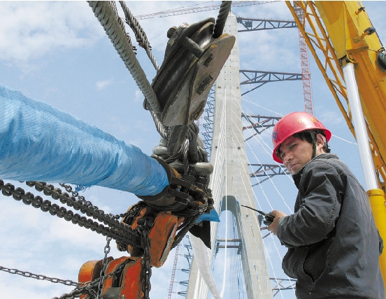 5月1日,象山港大桥工地一片繁忙,中交二公局300多名工人正在安装斜拉索。 纪顺利 摄