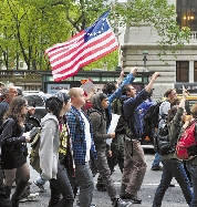 5月1日,“占领华尔街”运动抗议者在纽约曼哈顿街头进行抗议活动。