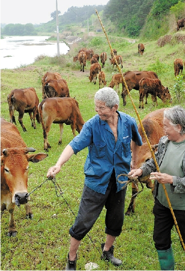 | 5月2日,东阳市歌山镇安溪村村民曹洪昌与老伴赶着牛群放牧。夫妻俩这些年来通过养牛,找到了一条致富之路。 东阳日报记者 包康轩 摄 |