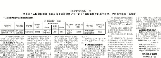 四、本次公开出让的详细资料和具体要求,详见玉土交出〔2012〕7号《玉环县国有建设用地使用权公开出让文件》。申请人可于2012年5月11日至2012年6月4日(不含法定节假日),到玉环县招投标中心土地产权交易部(玉环县财政局财务开发公司三楼)或玉环县土地交易中心(玉环县国土资源局二楼)获取公开出让文件。