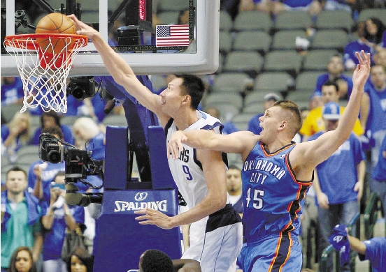 图为小牛队球员易建联(左)在比赛中扣篮。新华社发
