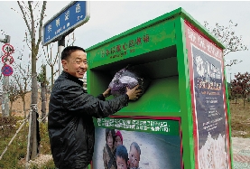 义乌市区出现一些旧衣服爱心回收箱。市民将不用的衣服投放其中,当地环保组织收集起来,清洗整理,送给贫困地区的低收入人群。 本报记者 李震宇 通讯员 张建成 摄