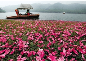 杭州迎来一场春雨,气温随之回落,一阵风雨刮过,白堤上的花瓣随风飘洒,就像花瓣雨。