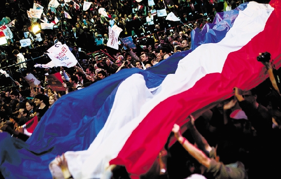 4月29日,法国社会党总统候选人奥朗德的支持者参加其在巴黎贝尔西体育场举行的大规模造势活动。 新华社发 (埃蒂安·洛朗 摄)