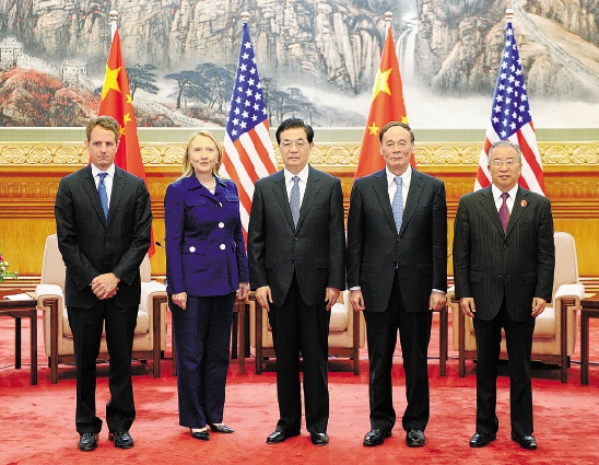 5月4日,国家主席胡锦涛在北京人民大会堂会见出席第四轮中美战略与经济对话的美国总统奥巴马特别代表克林顿国务卿和盖特纳财政部长。 新华社记者 李涛 摄