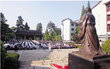 5月7日,绍兴市稽山中学举行孔子圣像揭幕仪式,近2500名师生向孔子像鞠躬致意。稽山中学曾经是绍兴官学之地,也是祭祀孔子之所。 梁永锋 摄
