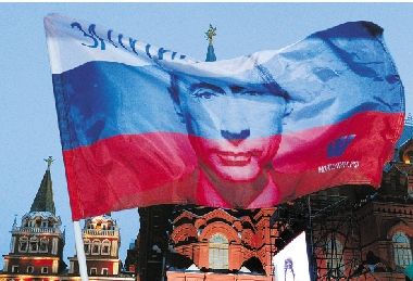 3月5日,在克里姆林宫外,印有普京肖像的旗帜迎风飘扬。 新华社发