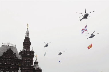 5月9日,悬挂俄罗斯国旗、武装力量旗帜以及陆军、海军和空军旗帜的5架米-8直升机飞掠莫斯科红场上空。 新华社记者 赵丹文 摄