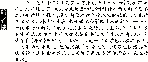 今年是毛泽东《在延安文艺座谈会上的讲话》发表70周年。70年过去了,我们今天重温和纪念《讲话》,面对的早已不是延安的烽火战争,我们所面对的是全球化时代视觉文化的整体视域。科技的发展,电子媒体和影像技术的翻新,一个新的技术时代的到来也在改变着今天的文化生态,但正如许多专家所说,文学艺术的根源依然需要扎根于生活本身,正如毛泽东在《讲话》中所说,“社会生活是一切文学艺术取之不尽、用之不竭的源泉”。这篇文献对于今天的文化建设依然具有现实针对性和指导意义,这是许多著名专家学者在此表达的共识。